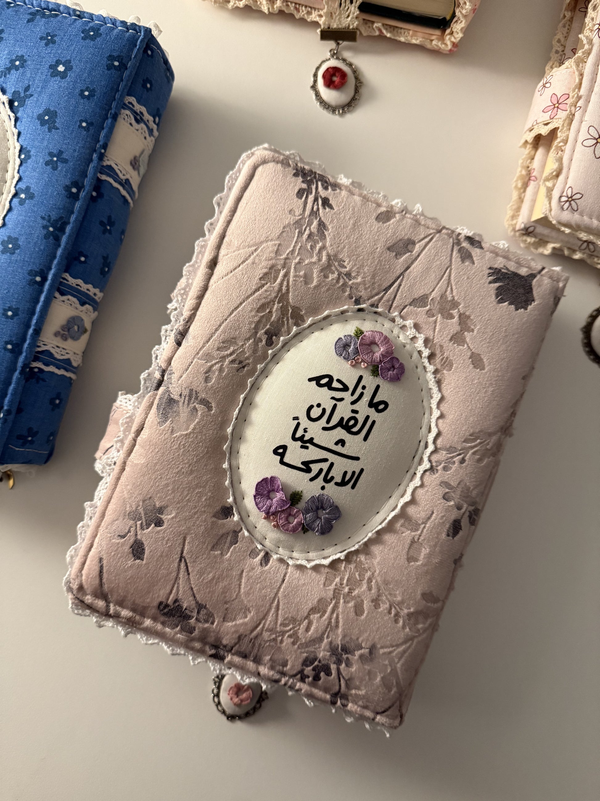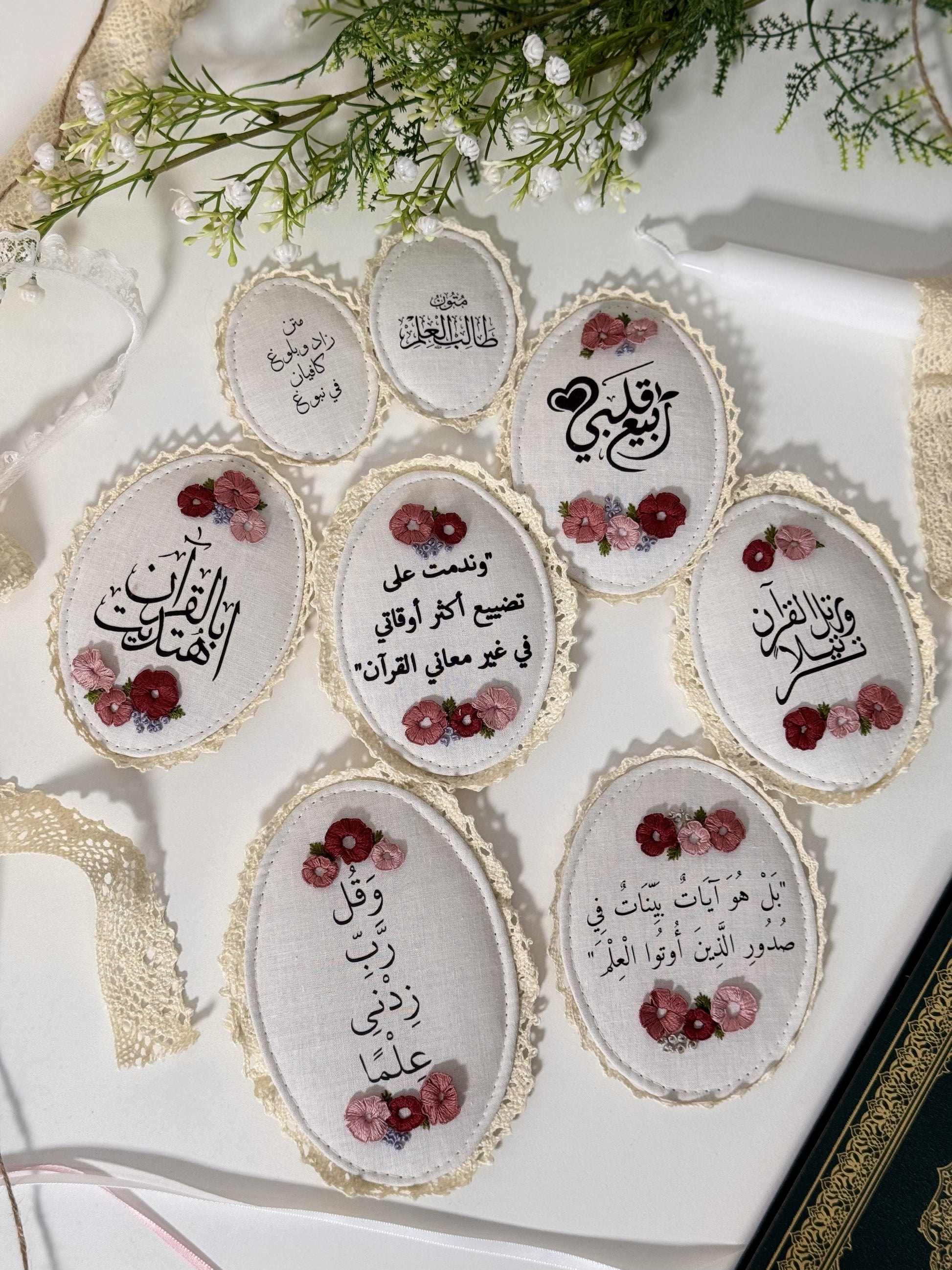 - your choice of bookmarks: ح/hifdh and م/muraja'a lace bookmarks or an embroidered medallion bookmark,